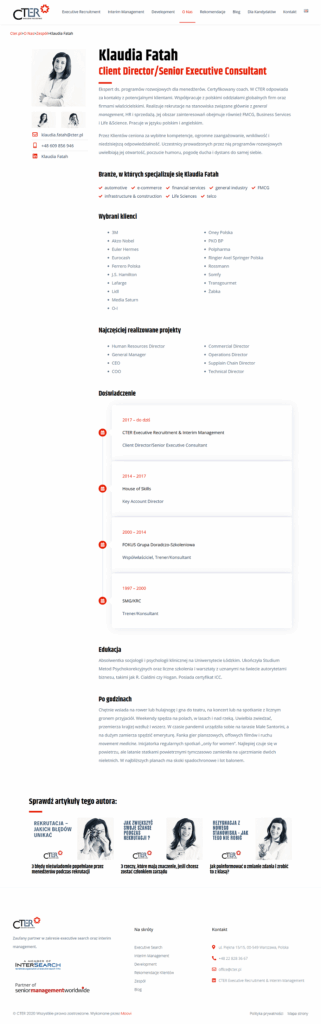CTER to średniej wielkości firma rekrutacyjna. Jej oferta skierowana jest do dyrektorów HR największych przedsiębiorstw i korporacji. Z klientami współpracuje długoterminowo i cieszy się bardzo dobrą opinią doświadczonych profesjonalistów z zasadami.