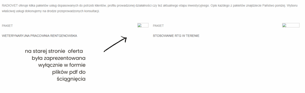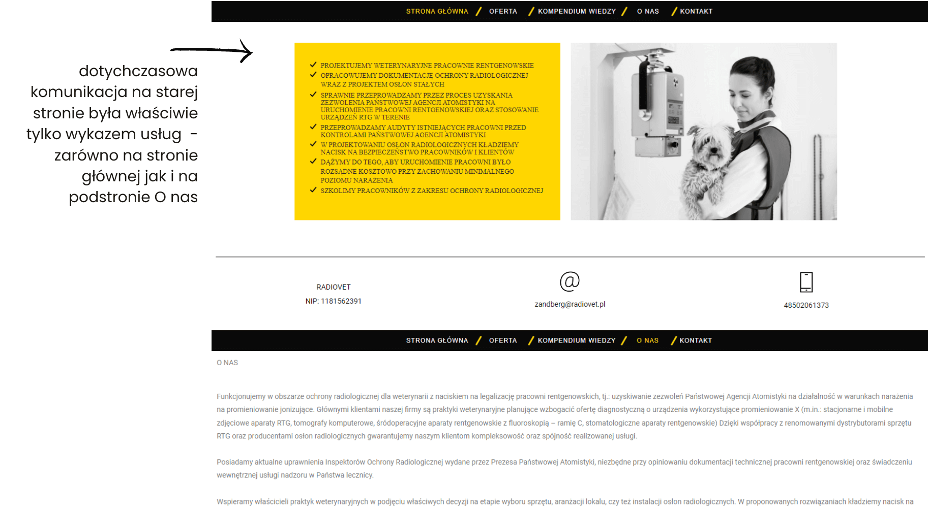 Dotychczasowa strona Radiovet była właściwie bardziej rozbudowaną wizytówką. Znalazły się tu króciutkie informacje o usługach. Była nawet baza wiedzy, ale składała się tylko z jednozdaniowych odpowiedzi na pytania.