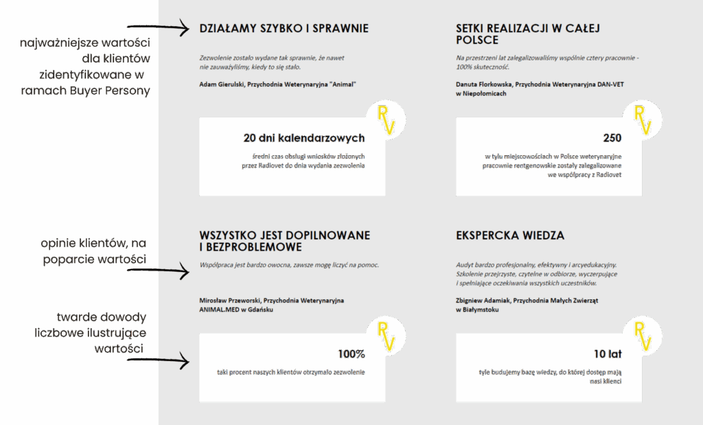 Wykorzystaliśmy tu wywiady Buyer Persona – mieliśmy gotowe cytaty z wypowiedzi klientów. Tam gdzie nam ich brakowało, klient zebrał je dodatkowo.