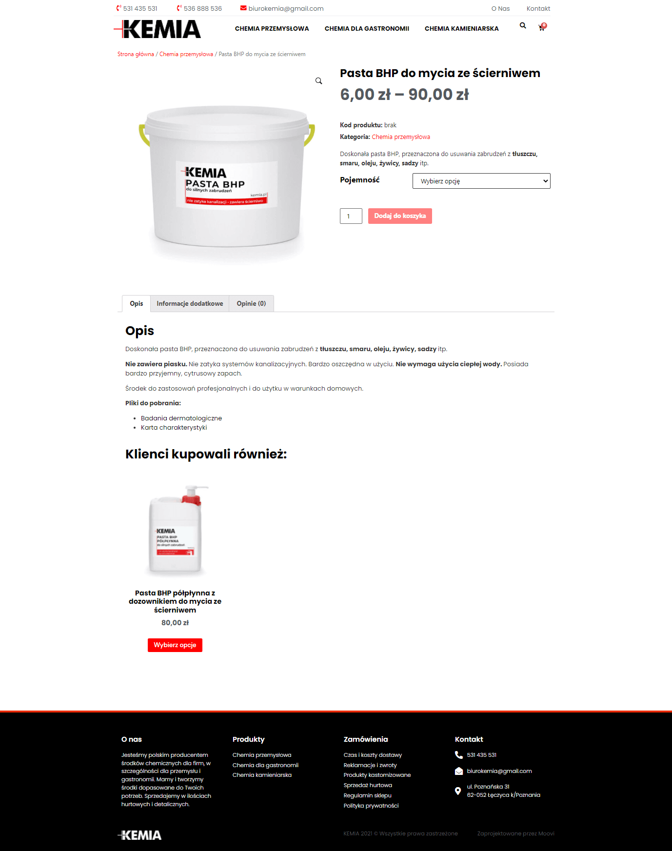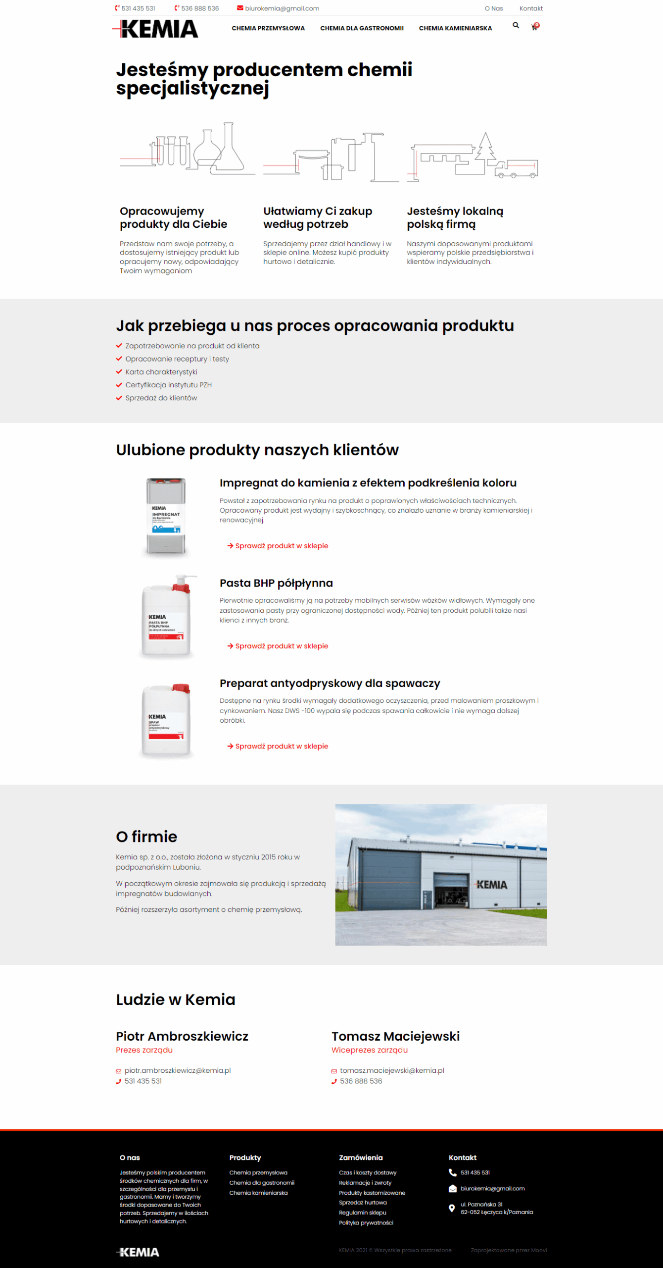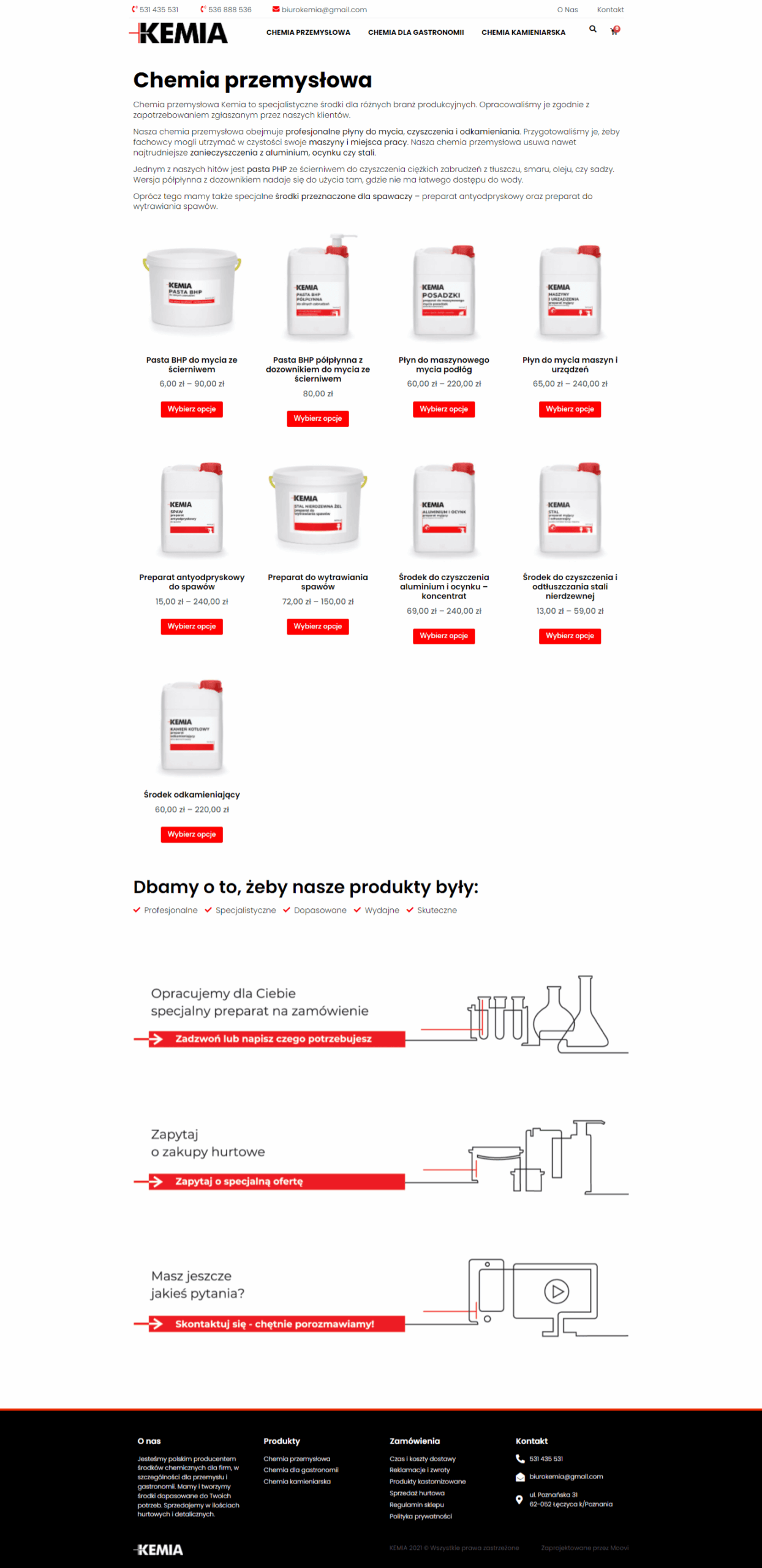 Strona buduje zupełnie nowy, profesjonalny wizerunek firmy Kemia po rebrandingu. Uwzględnia pozyskiwanie klientów indywidualnych w sklepie internetowym z chemią specjalistyczną, ale przede zachęca firmy do kontaktu w sprawie dużych zamówień.