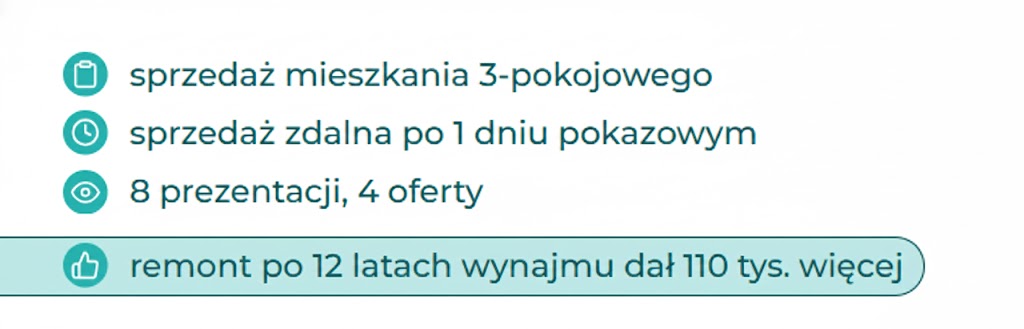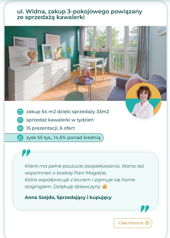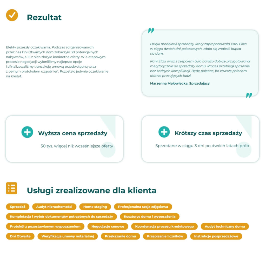 Dla jednego z naszych klientów, agencji nieruchomości z Wrocławia, stworzyliśmy miejsce, które eksponuje efekty i unikalny sposób ich pracy. Oto przykładowe dowody, które zamieściliśmy na ich stronie (i które powinny znaleźć się na Twojej), aby przekonać niezdecydowanych klientów: